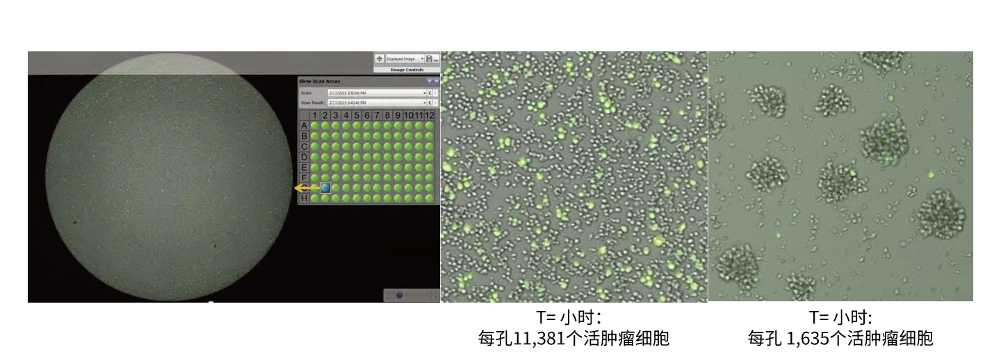 腫瘤細胞殺傷動態(tài)檢測:在使用Calcein AM進行無損、動態(tài)實驗的過程中,我們在第0小時和第6小時獲取同-96孔板(顯示于下側(cè))的圖像。Celigo圖像證實:在同一孔中,Calcein AM陽性活腫瘤細胞的數(shù)量從11,381減少到1,635。