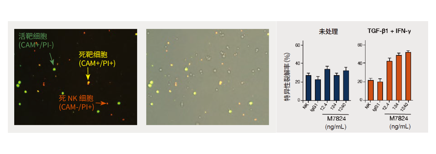 對calcein AM陽性活細胞進行計數(shù),以測定共培養(yǎng)細胞中雙功能融合蛋白(M7824)對NK細胞介導(dǎo)的細胞毒性的影響。