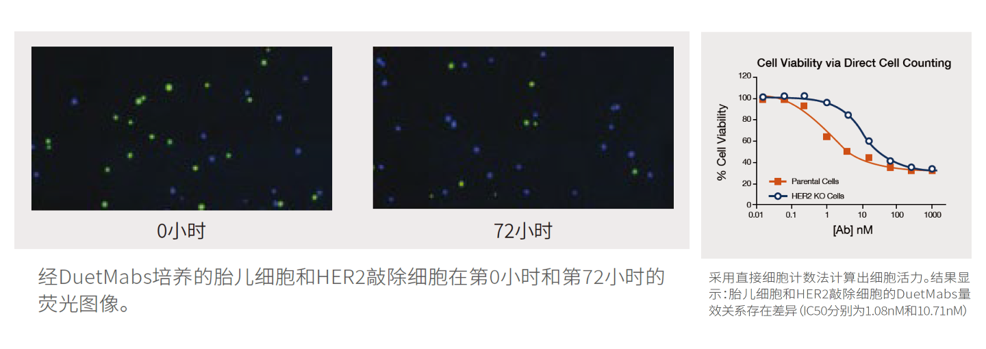 Celigo對胎兒細胞(CellTrackerGreen染色)和HER2敲除細胞(CellTracker Violet染色)的共同培養(yǎng)體系進行直接計數(shù)。該實驗研究了單價雙特異lgG(DuetMab)對胎兒細胞和HER2敲除細胞共培養(yǎng)體系的選擇性細胞毒性作用。