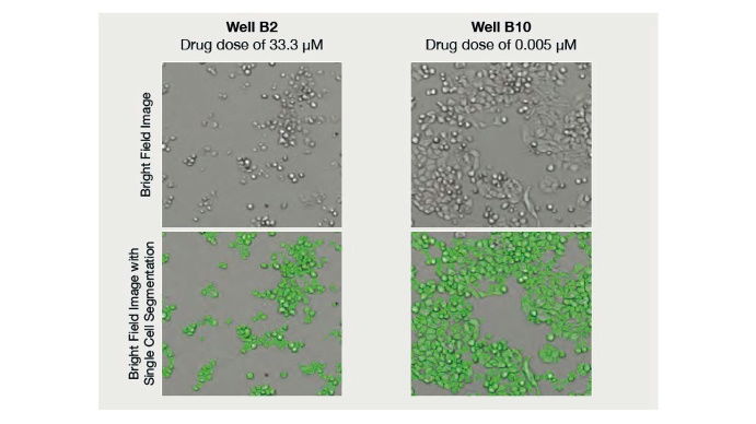生成的圖像(顯示于左側(cè))來自兩個孔:B2和B10;之后分別按照33.3um和0.005um的劑量對兩個孔進行藥物處理。