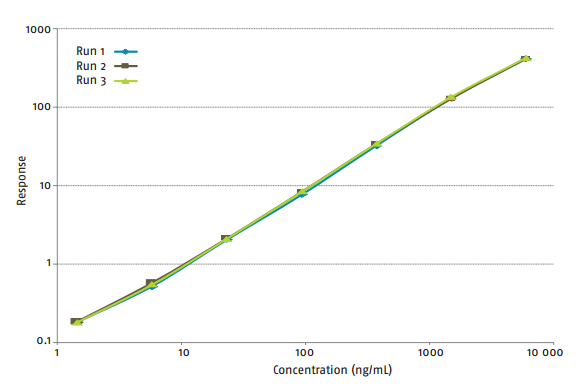 寬廣的動態(tài)范圍:將稀釋度和重復(fù)性最小化,通過 15nl 親和柱樣品捕獲反應(yīng)體系,有效的提升數(shù)據(jù)動態(tài)范圍,減少基質(zhì)效應(yīng)。