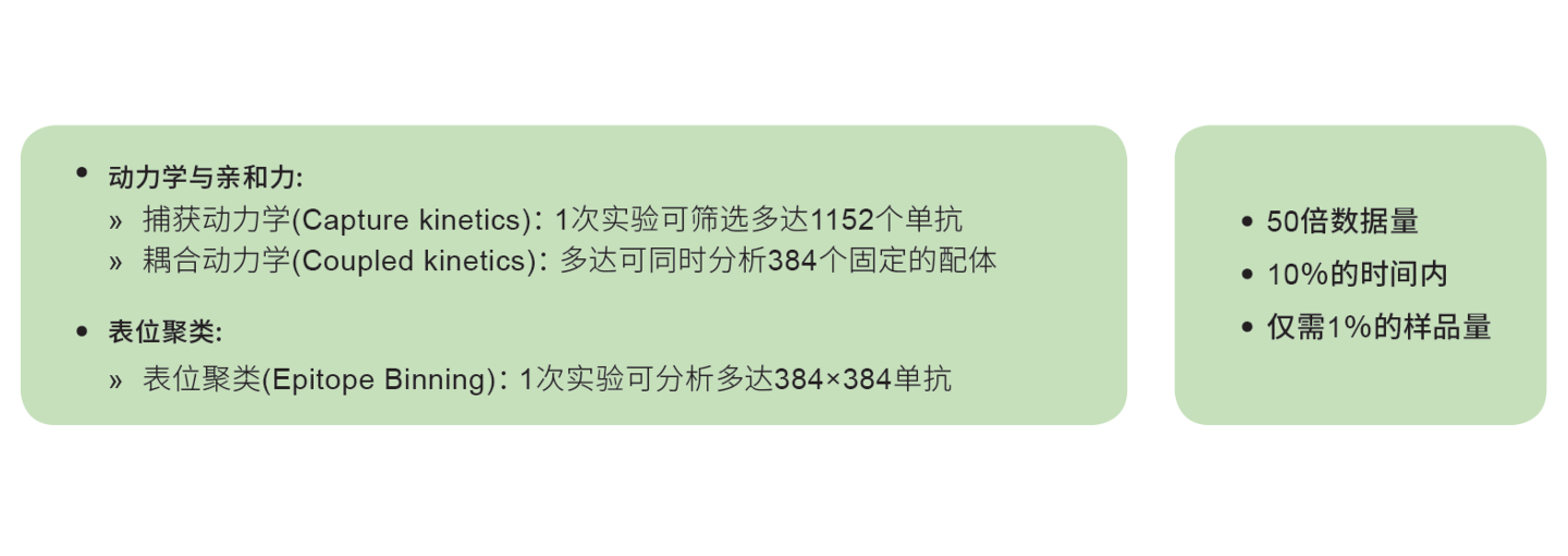 LSA是全方位集成的高通量單克隆抗體篩選和表征的平臺,此平臺將連續(xù)流微流控技術(shù)與陣列式表面等離子體共振(SPR)檢測結(jié)合再一起,從而實現(xiàn)高通量動力學(xué)(kinetics)和表位發(fā)現(xiàn)(epitope discovery) 的應(yīng)用,以完成先進水平的抗體開發(fā)項目。