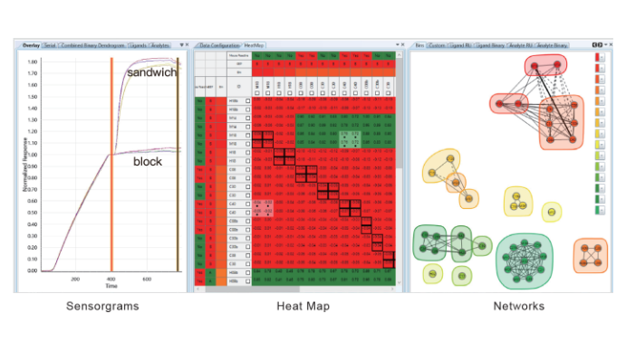 Epitope Binning 軟件可進行快速有效的384x384單抗競爭基質(zhì)實驗,揭示出精致微小的表位差異并判別獨特/細(xì)微的結(jié)合物。如下數(shù)據(jù)展示:在三個可視化面板上,提供原始數(shù)據(jù)(raw data),排序的熱圖(sorted heat map)和易干理解的網(wǎng)絡(luò)聚類圖(network plot)的全面視圖。